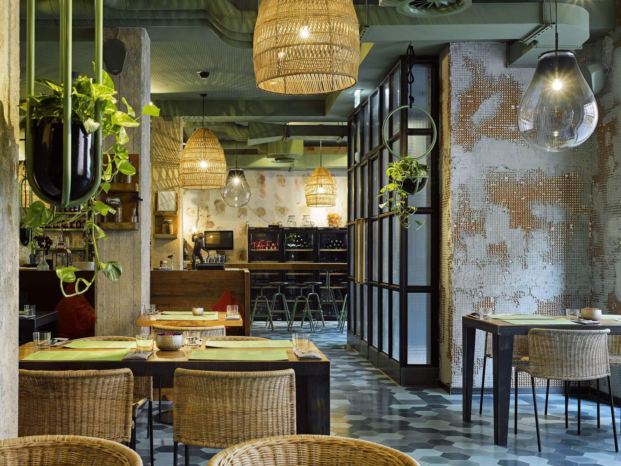 Die Innenarchitektur spiegelt den harmonischen Clash zwischen alten und modernen Kulturen wider. Industrielle Elemente wie roh verputzte Ziegelsteinwände und Betonsäulen bilden einen spannenden Kontrast mit spanischen Ornamentziegelsteinen, Lampenschirmen aus tunesischen Strohkörben und glasierten, indischen Fliesen in Blautönen. Der Neon-Schriftzug an der Wand liefert die Philosophie des Ortes: das Wort „Freund“ auf Hebräisch und Arabisch. „Unsere Inspiration?“ fragt Thomas Tritsch. „Leben in Tel Aviv, ein großes Durcheinander echter Werte und Dramen, Farben des Meeres und des Himmels, das Unfertige als Status Quo.“