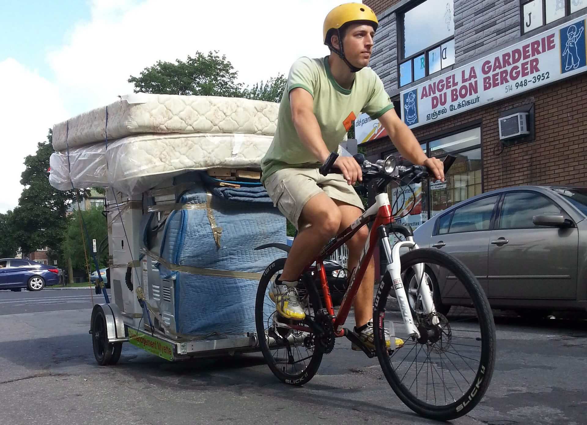 Den kanadischen Nationalfeiertag feiert in Quebec niemand: Laut Statistik ziehen am 01. Juli mehr als 700.000 Haushalte um, davon rund 200.000 in Montreal. Wer es sich leisten kann, heuert für den „Moving Day“ rechtzeitig ein Umzugsunternehmen an. Aufgrund horrender Preise und mangelnder Ressourcen bietet es sich allerdings an, möglichst viel selbst zu transportieren. Ob mit dem Auto, mit dem Fahrrad oder gar zu Fuß: Gigantische, selbstgebaute Waggons mit bis zu 250 Kilogramm festgezurrter Ladung, blockierte Gehsteige und versperrte Straßen bestimmen an diesem Tag das Stadtbild.