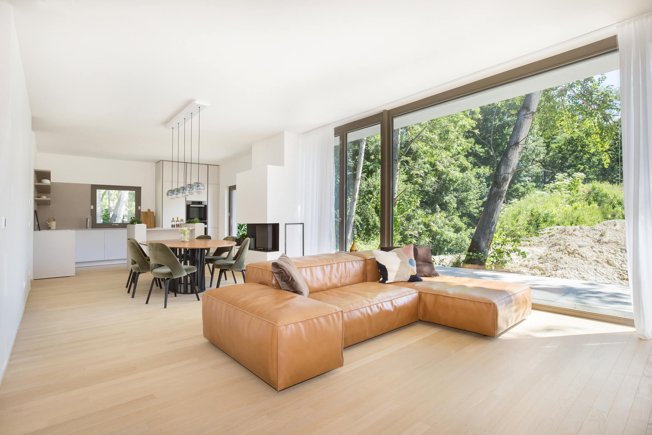 Das Interior Konzept des Musterhauses ist vom skandinavischen Design inspiriert und führt in Materialien, Farben und Stimmungen die progressive Architektur im Inneren fort. Natürliche Materialien und zeitlos-funktionale Formen verleihen den Wohnräumen eine nordische Leichtigkeit – unterstrichen von New Nordic Marken wie Ferm Living, Hay oder By Lassen. Die SieMatic-Küche fügt sich harmonisch ein. In der Farbgebung folgt das Interior des Musterhauses der umgebenden Natur: Von Moos- und Tannengrün, über erdige Beige- und Brauntöne bis hin zum frischen Blau des Ammersees bilden Innen und Außen eine Einheit. Auch der Ausstattungspartner ist lokal: Die Möbeleinbauten stammen von der ortsansässigen Schreinerei Darchinger.