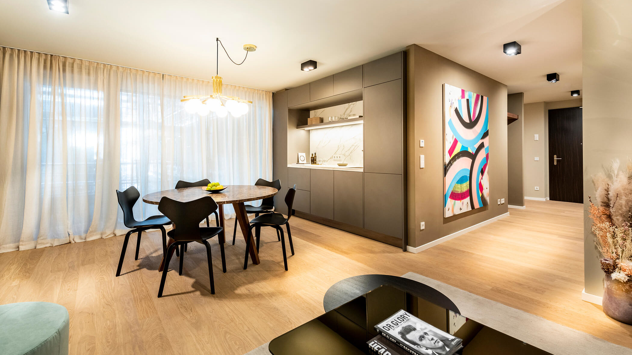 Weiche, organische Formen sowie erdige Töne und Wandfarben betonen die Räume und zonieren die offen gestalteten Wohnbereichen. Die Farbbasis bilden helle Grau-, Braun- und Beigeschattierungen in Kombination mit warmen Tönen wie Radicchio und Inchyra Blue, durchbrochen von kräftigen Farbakzenten. Spannung erzeugt auch die Kombination aus Messing und Nussbaum. Möbelstücke von internationalen Designern sowie maßgeschneiderte Sonderanfertigungen von MORGEN setzen Akzente. Die elegante Formensprache der SieMatic Küche aus der Stilwelt PURE mit steingrauen Fronten und samtigem Finish fügt sich harmonisch in das Interior-Konzept ein.