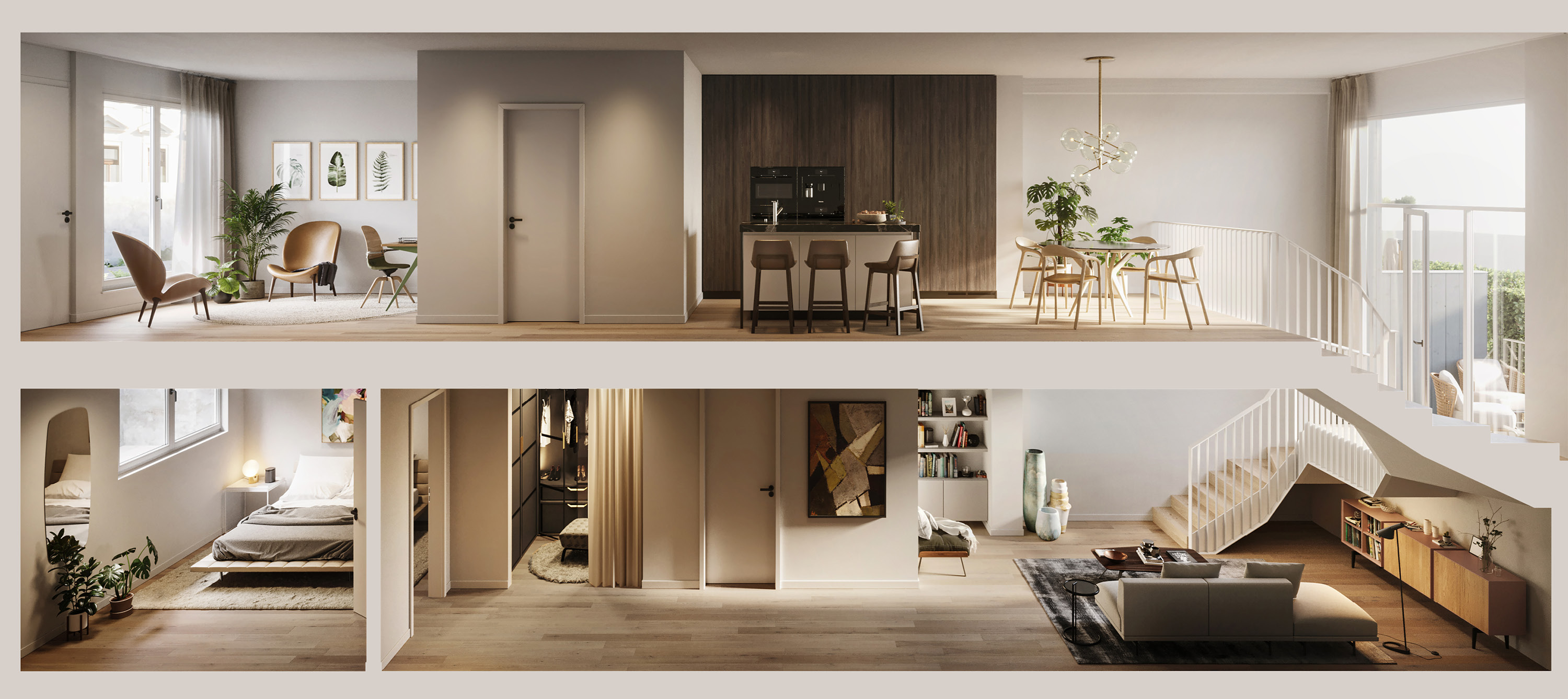 The private entrance in the courtyard house welcomes residents and guests to the garden maisonette. Designed on two floors, it offers the finest townhouse living in the centre of the VINZENT ensemble.