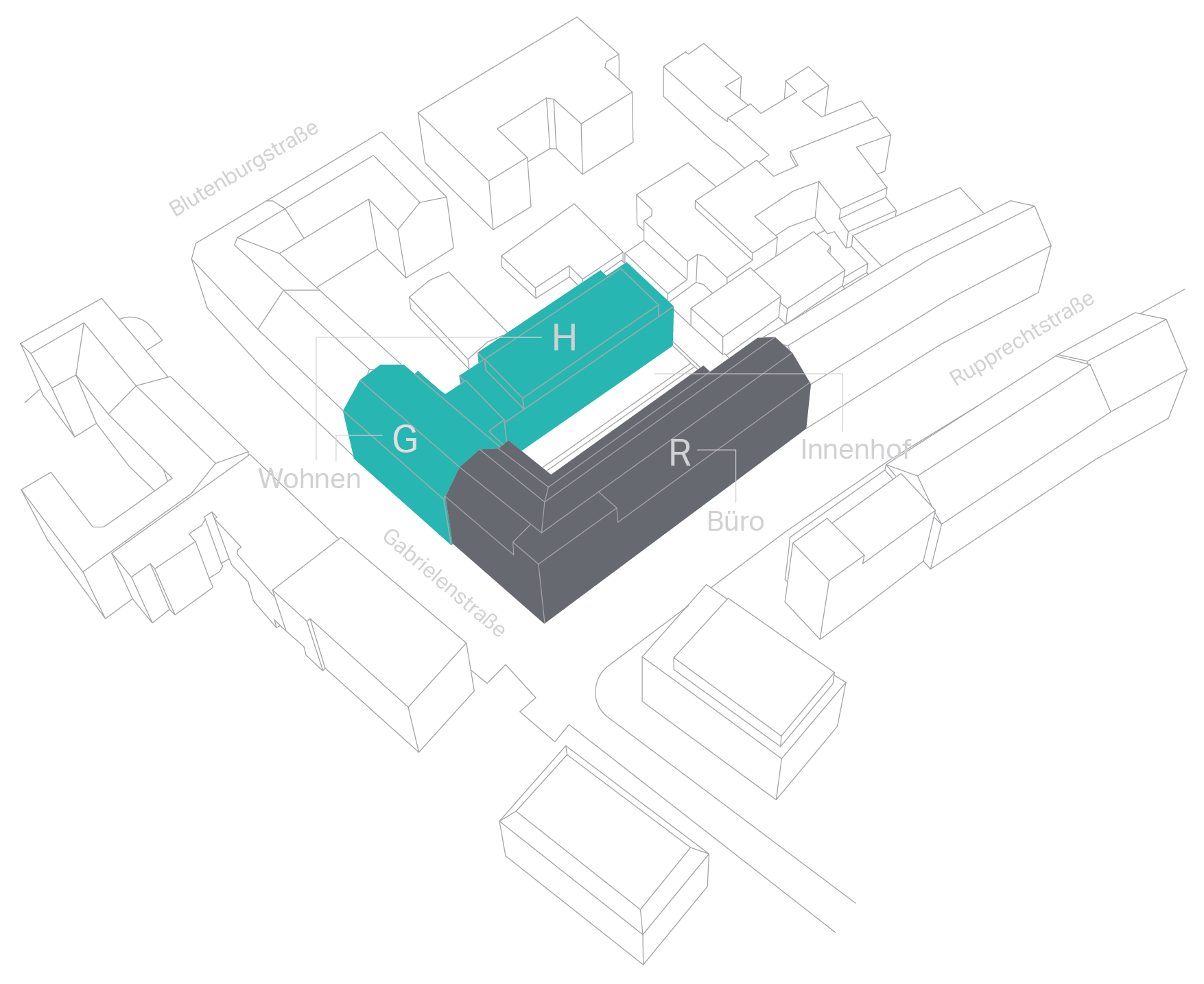 The front building along the quiet Gabrielenstrasse and the courtyard house offer diverse living space. Additional living value is created by green balconies, terraces, roof gardens and roof terraces. The office building adjoins the front building. The green inner courtyard is an attractive link, serving as a meeting place and a haven of peace.