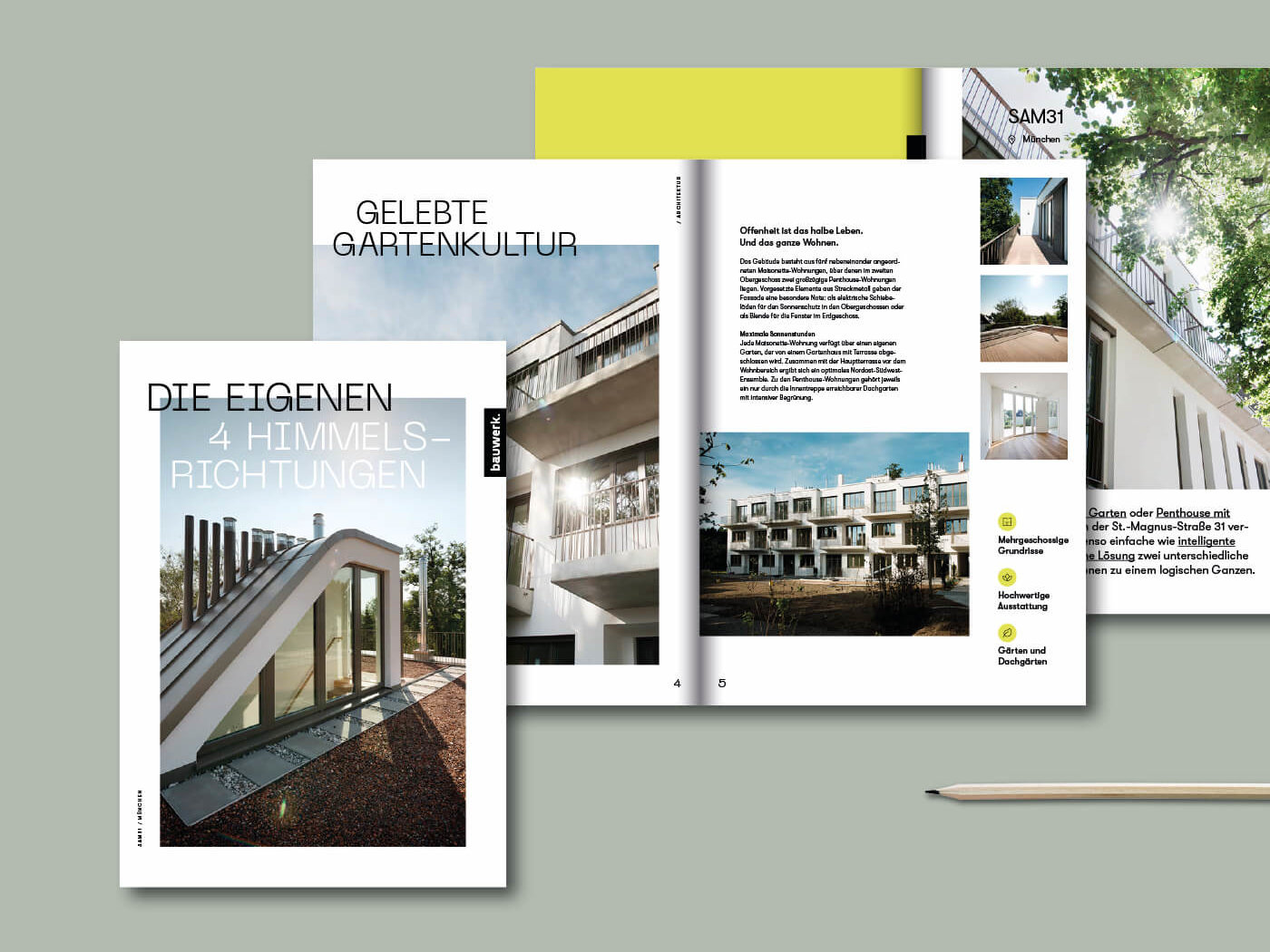 Bei den Penthouse-Wohnungen bilden die offene Wohnzone (mit flexibler Abfolge von Kochen, Essen und Wohnen) und ein zum Garten hin orientierter Schlafbereich (Elternschlafzimmer mit zugeteiltem Bad und Ankleide, zwei Kinderzimmer und zwei weitere Bäder) ein Raumgefüge von hoher architektonischer Qualität. Darüber hinaus gibt es je nach Penthouse-Wohnung ein Gästezimmer, eine Speisekammer, ein Gäste-WC und einen Hauswirtschaftsraum. Eine Treppe führt zum privaten Dachgarten.