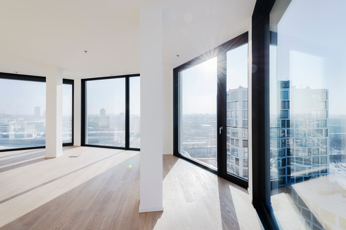 Aufsehenerregende Architektur und innovative Features: Im Neubauprojekt FRIENDS genießen die Bewohner in bis zu 53 Meter Höhe die Qualitäten eines Architekturkonzepts, das auch jenseits der bayerischen Landeshauptstadt wegweisend ist.Ein Projekt der LBBW Immobilien-Gruppe.Fertiggestellt 2016